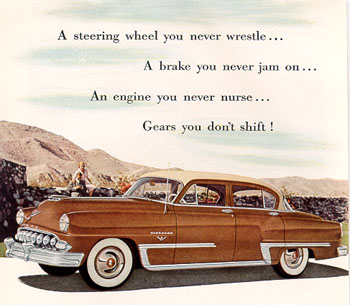 During the late Forties and early Fifties, new V-eight engines from Cadillac, Chrysler and Oldsmobile were at the forefront of an emerging horsepower race. Large family cars with inline sixes, like DeSoto, were becoming passe. DeSoto answered the challenge with FireDome, a sparkling, hemi-head V-eight powering a new carline by the same name. FireDome eclipsed its bigger Chrysler Firepower brother by delivering more road horsepower per cubic inch displacement than any other motor. FireDome cut four seconds from the time last year's DeSoto needed to travel from 0-60. Top speed was increased to 100mph. What astonished everyone was how effortlessly FireDome produced its 160hp. at 4,400 rpm. The 1952 Oldsmobile Supper 88 V8, considered by many of the day to be a paradigm of performance, required 303 cubic inches, 7.5:1 compression, a four barrel carburetor and premium gasoline to make 160 horsepower. The DeSoto FireDome needed only 276.1 cubic inches, 7.0:1 compression, a two barrel carburetor, and regular gasoline for the same 160hp. In addition, FireDome's hemi-head limited pinging and resisted power robbing combustion chamber deposits. DeSoto was overly modest about the FireDome. One 1952 DeSoto television advertisement chose not to mention the V8. Instead, the commercial pictured a stark, black, six cylinder DeSoto sedan that the announcer described as having chair high seats, plenty of interior room, and a smooth ride thanks to Oriflow shock absorbers. A happy family piled into the DeSoto and rode away smiling. Regardless of the 45,830 DeSoto FireDomes that were built, overall DeSoto production had fallen from a disappointing 106,000 (est) in '51, to an abysmal 88,000 (est) in '52. That same year, Chrysler Corporation was overtaken by Ford as the country's second most prolific auto maker. Labor problems and war production priorities were partly to blame.