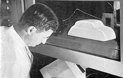 Wind tunnel testing began in 1927. Chrysler engineers discovered that contemporary automobiles moved more efficiently through the air with the body reversed. Hence the "backwards" DeSoto Hartz drove. The revelation prompted an ambitious quest for the ideal aerodynamic body that would save gasoline and increase speed. The search would inspire a fundamental re-evaluation of car design, and bring true modernity to motoring. The result was the 1934 DeSoto Airflow, DeSoto's boldest adventure. "Goodbye 'Horseless Carriage,'" shouted DeSoto advertising, "Here's the New Airflow DeSoto!" Airflow styling said, "Woosh!" Blown away were free-standing headlights, radiator shells, side-mounted spare tires, and bobbed tails. In their place was a svelte, envelope body whose lines slithered fore and aft in a relaxed arch. Most radical was the front, whose waterfall grille simply let the wind pass so that the car may go faster. Sleekness was only part of the package. The DeSoto Airflow concealed a revolutionary chassis with the interior moved 20 inches forward. Correspondingly, the engine compartment was placed between rather than behind the front wheels. Not only did this new configuration cradle passengers within the wheelbase, but it reversed traditional weight distribution for a front end bias, eliminating fore and aft pitching and reducing rebound motion by 20%. The result was a smooth "amidships ride." It's an arrangement most new cars have followed ever since. DeSoto promotions liked to say that an Airflow passenger could comfortably read his newspaper while the driver navigated a dirt road at 80mph. DeSoto was so confident of Airflow's on-road stability that hand straps were purposefully eliminated from the cabin. The interior was among the most luxurious and safest in the world. Beautifully upholstered seats set in chrome frames offered the industry's first comfortable six passenger capacity. Ventilation was outstanding due to airspace beneath the front seats, elaborate dual action windows in the front doors, twin cowl vents and crank out windshields. Being cool and comfortable meant the Airflow driver could better appreciate the ergonomically angled steering wheel that allowed shoulders to relax.