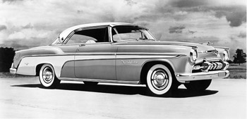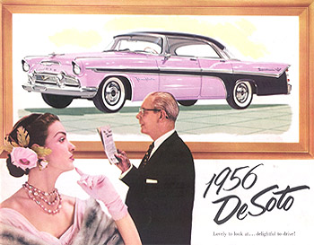 Riding in a '55 DeSoto was an experience. The engine was whisper quite and the ride super smooth. There seemed to be miles between the driver and front seat passenger. Everywhere, there was quality whether it was the Fireflite Sportsman's leather upholstery or the Firedome's glossy dashboard. A '55 DeSoto was sure to please even the most jaded consumer. Of course, sales were high. 114,765 DeSotos found happy owners for the 1955 model year. The calendar year total of 131,753 was the best since 1946. Then something curious happened. The auto industry experienced a significant downturn in 1956. Oldsmobile lost over 97,000 sales, Buick more than 100,000 and Pontiac nearly 150,000. At Chrysler Corporation, Dodge sales eased by 36,000 cars and Chrysler sales by 24,000. DeSoto, however, built nearly as many cars in 1956 as it had in 1955. Model year production totaled 110,418, only 4,347 cars fewer than '55. To top it off, more DeSotos than Chryslers were registered that year and DeSoto climbed to 11th place in the industry. Regardless, five years later DeSoto would be canceled. The dynamics of DeSoto's demise were already in motion. Top management at Chrysler Corporation suggested Chrysler drop its bottom line Windsor to allow more room for DeSoto. Chrysler protested. Since 1946, Chrysler had fostered its low end products and by 1956 was dependent on the 2/3s volume provided by Windsor. Besides, Chrysler no longer had the option of moving up-market. The majestic Imperial was jettisoned in 1955 as a separate make to compete alone with Cadillac and Lincoln. Having already put itself in a difficult place, Chrysler would make no concession to DeSoto.