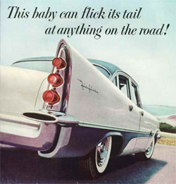 DeSoto's slogan was no joke. The DeSoto pace car was a fire-breather equipped with the Adventurer's engine. With DeSoto Division president L. Irving Woolson at the wheel, the DeSoto pace car broke all previous pace car lap speed records. The convertible was doing better than 100 miles per hour when it left the racers. The exotic Adventurer aside, the DeSoto Fireflite came with more standard horsepower than most cars in its category. At 255hp., the Fireflite V8 was more robust than anything from Mercury, Oldsmobile, or Pontiac, and equal to Buick's biggest engine. Zero to 60 took an effortless 10.9 seconds and the top speed was 110 miles per hour. Back in the fifties, automotive evolution progressed at a frantic pace with car manufactures bringing out new models every two or three years. DeSoto was due for something new in 1957, but no one could have predicted how new the '57 DeSotos turned out to be. 1957 DeSoto television commercials merrily sang, "The most exciting car today is now delighting the far highway. It's DELOVELY! It's DYNAMIC! It's DeSOTO!" The jingle didn't exaggerate. The 1957 DeSotos were amazing cars, perfect for the space age.