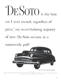 When civilian automobile production resumed late in 1945, customers returned the favor of DeSoto's patriotism by flocking to its show rooms. "Demand," said DeSoto, "is so great that in spite of all our efforts some delay may be necessary before your dealer can make delivery to you." Material shortages and labor strife contributed to DeSoto's inability to fill orders. However, it was true that a segment of car starved America didn't just want new cars, it wanted new DeSotos. 1946 DeSoto promotions joyfully bragged "8 out of 10 want DeSoto again." The boast was based on a survey of 1941 and 1942 DeSoto owners. Demand peeked with the 1950 DeSoto. 1950 DeSotos were handsome machines with wide chromium grins and strong correct lines. They were huge cars, bigger than Mercurys, Pontiacs, Oldsmobile 88s, Buick Supers, and the Packard Eights. There was even a new model to strut DeSoto's many virtues, the Custom Sportsman hardtop coupe.